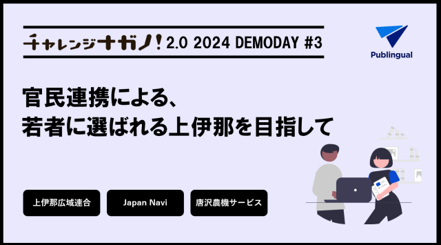 長野県が主催(運営事務局:株式会社Publink)する、長野県内の市町村が抱える課題を、多様な企業とのオープンイノベーションによって解決する取り組み「チャレンジナガノ2.0」」。