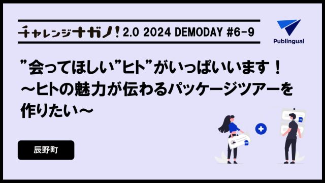 今回チャレンジナガノに募集させて頂いた内容としては、まず我々がサテライトオフィスの誘致事業を行っておりまして、それの前段階として、地元の旅行会社と協業してパッケージツアーの企画や運営を行っています。それに対して、認知の拡大や企画運営のサポートをして頂ける企業さんを募集させて頂きました。メインとしては、辰野町に集まる能動的で面白いプレイヤーの魅力を巡るツアーを軸に募集させて頂きました。